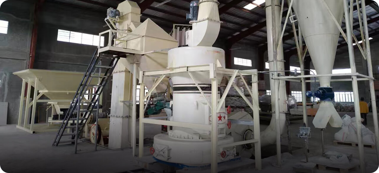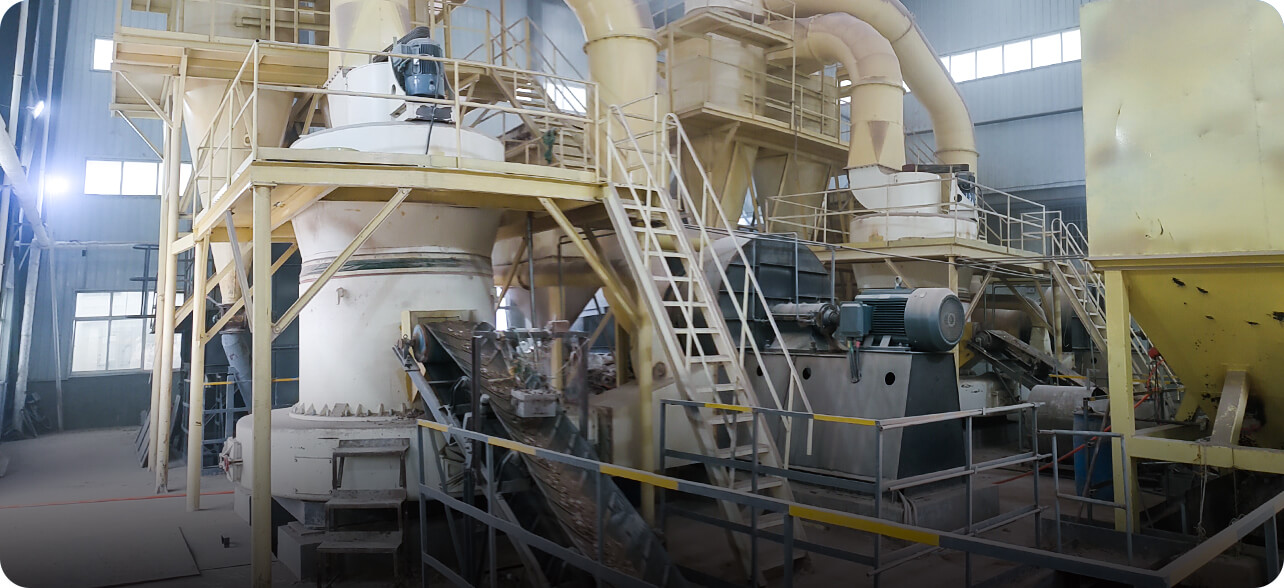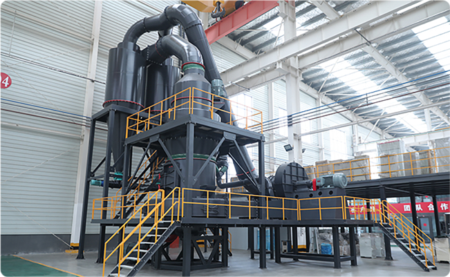 大塊物料進(jìn)入顎式破碎機(jī)后進(jìn)行初級(jí)破碎,然后由斗式提升機(jī)將合適粒度的物料均勻送至儲(chǔ)料倉。通過電磁振動(dòng)給料機(jī)把儲(chǔ)料倉的物料均勻、定量、連續(xù)地送到磨粉機(jī)的研磨室內(nèi)進(jìn)行研磨。研磨后的粉末在鼓風(fēng)機(jī)的作用下吹向選粉機(jī)進(jìn)行分選,合格細(xì)粉則由管道送至儲(chǔ)料倉,分選后的不合格粉料回落繼續(xù)研磨,最后經(jīng)出料閥輸出即為成品粉料。篩分后合格的成品細(xì)粉隨管道裝置進(jìn)入收塵器內(nèi)分離收集,并統(tǒng)一用裝粉罐車打包或送入成品料倉內(nèi)即可。