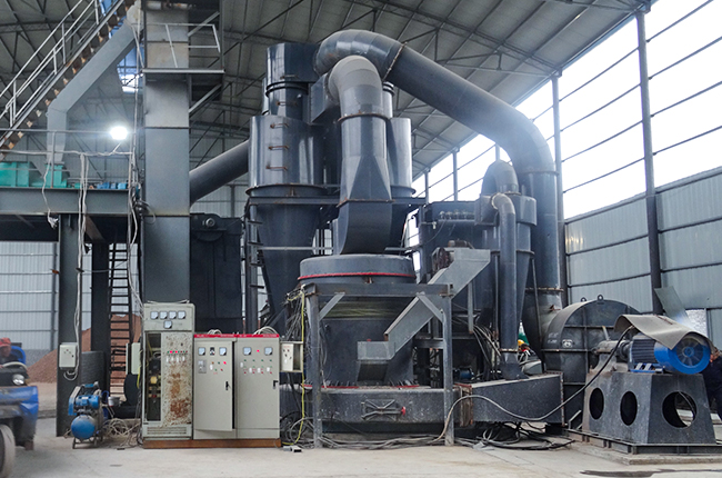 大塊石料在破碎機(jī)充分破碎后,由斗式提升機(jī)送至儲(chǔ)料斗,之后由電磁振動(dòng)給料機(jī)有序送至主機(jī)內(nèi)研磨。主機(jī)內(nèi)懸掛于梅花架上的磨輥裝置繞中心軸旋轉(zhuǎn),磨輥同時(shí)繞磨輥軸自轉(zhuǎn),在離心力的作用下,磨輥向外擺壓緊磨環(huán),旋轉(zhuǎn)的鏟刀鏟起的物料被拋向輥環(huán)之間,因磨輥的滾碾以達(dá)到粉碎和研磨作用。磨碎室的粉末被鼓風(fēng)機(jī)的氣流吹到主機(jī)上方的分析機(jī)進(jìn)行分析,細(xì)度過粗的石粉由于自重則落入主機(jī)內(nèi)重磨,合格細(xì)粉則隨風(fēng)流進(jìn)入到大旋風(fēng)收集器,收集后經(jīng)出料管排出即為成品。