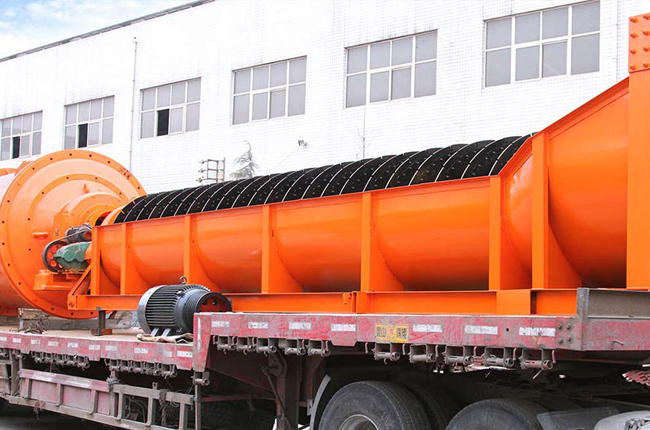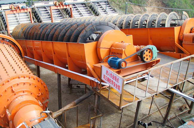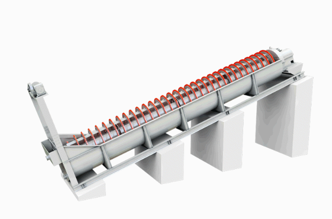 螺旋分級機借助固體顆粒的比重不同,因而在液體中沉淀速度不同的原理,進行機械分級的一種設備。能把磨出的料粉進行過濾,然后把粗料利用螺旋片旋片旋入磨機進料口,把過濾出的細料從溢流管子排出。