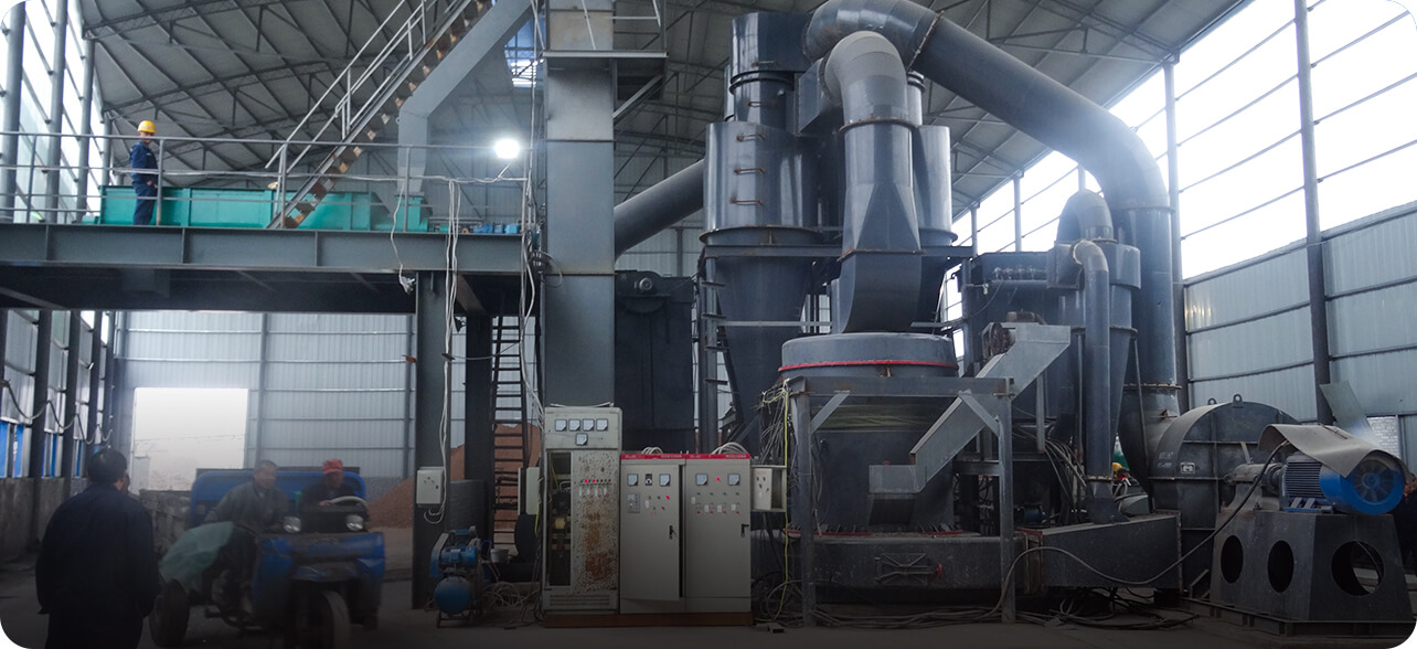 大塊物料進(jìn)入顎式破碎機(jī)后進(jìn)行初級(jí)破碎,然后由斗式提升機(jī)將合適粒度的物料均勻送至儲(chǔ)料倉。通過電磁振動(dòng)給料機(jī)把儲(chǔ)料倉的物料均勻、定量、連續(xù)地送到磨粉機(jī)的研磨室內(nèi)進(jìn)行研磨。研磨后的粉末在鼓風(fēng)機(jī)的作用下吹向選粉機(jī)進(jìn)行分選,合格細(xì)粉則由管道送至儲(chǔ)料倉,分選后的不合格粉料回落繼續(xù)研磨,最后經(jīng)出料閥輸出即為成品粉料。篩分后合格的成品細(xì)粉隨管道裝置進(jìn)入收塵器內(nèi)分離收集,并統(tǒng)一用裝粉罐車打包或送入成品料倉內(nèi)即可。