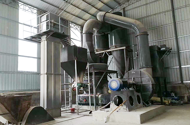 大塊石料在破碎機(jī)充分破碎后,由斗式提升機(jī)送至儲(chǔ)料斗,之后由電磁振動(dòng)給料機(jī)有序送至主機(jī)內(nèi)研磨。主機(jī)內(nèi)懸掛于梅花架上的磨輥裝置繞中心軸旋轉(zhuǎn),磨輥同時(shí)繞磨輥軸自轉(zhuǎn),在離心力的作用下,磨輥向外擺壓緊磨環(huán),旋轉(zhuǎn)的鏟刀鏟起的物料被拋向輥環(huán)之間,因磨輥的滾碾以達(dá)到粉碎和研磨作用。磨碎室的粉末被鼓風(fēng)機(jī)的氣流吹到主機(jī)上方的分析機(jī)進(jìn)行分析,細(xì)度過粗的石粉由于自重則落入主機(jī)內(nèi)重磨,合格細(xì)粉則隨風(fēng)流進(jìn)入到大旋風(fēng)收集器,收集后經(jīng)出料管排出即為成品。