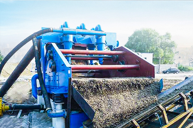 砂水混合物進入清洗箱,由葉輪分離機進行分離,然后進入下層脫水篩做脫水處理,清洗箱溢流出的廢水(含大量細砂、泥漿、粉塵等雜質(zhì)),經(jīng)真空高壓泵輸送到高壓分離器中,然后離心分濃縮后的細沙,經(jīng)沉沙嘴排入脫水篩上層,清洗箱內(nèi)的廢水、泥、粉塵、雜質(zhì)等,通過高壓分離器溢流口,排入高位返水箱后排出,上層出成品料粗砂,下層出成品料細砂,或粗、細砂混合。